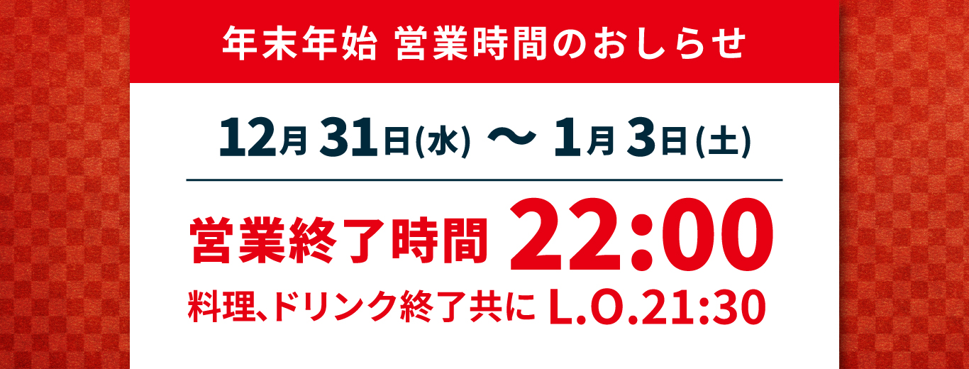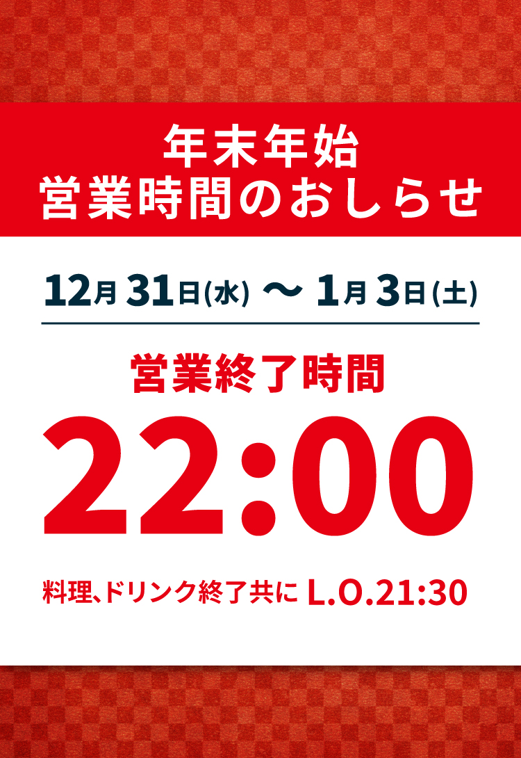 | 営業時間 | 17:00〜23:00 (L.O.22:30) 年末年始の営業時間の変更について 12月30日(火)通常営業(17:00-23:00) 12月31日(水)17:00-22:00 1月1日(木) 17:00-22:00 1月2日(金) 17:00-22:00 1月3日(土) 17:00-22:00 料理、ドリンク終了共にLO21時30分 1月4日(日)通常営業(17:00-23:00) |